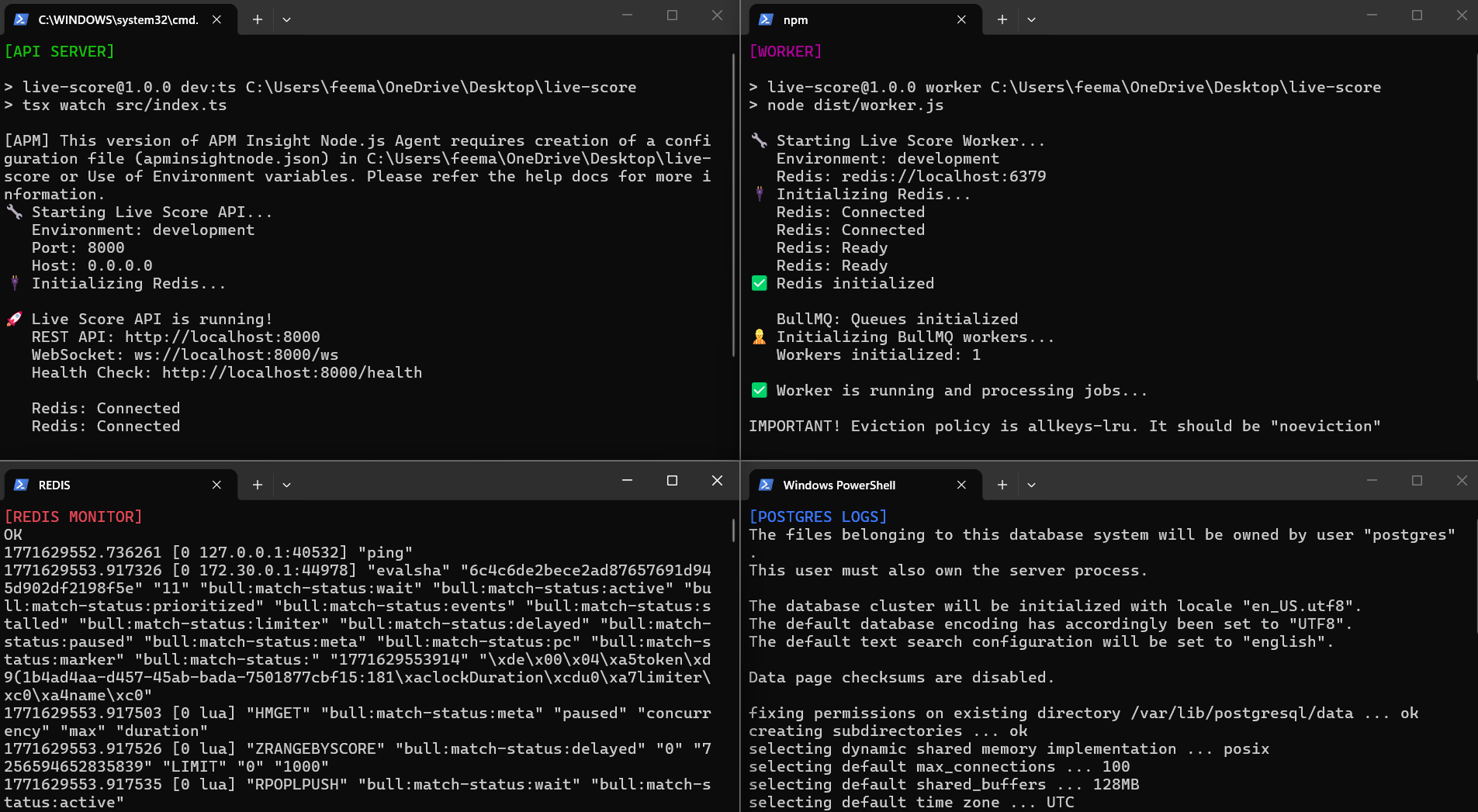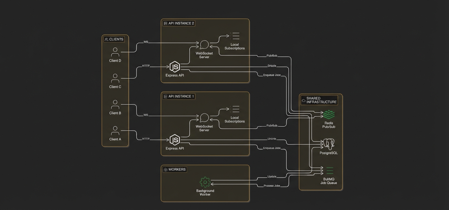 Live Score API is a distributed systems showcase built to solve the single-node limitation I encountered in earlier projects. Unlike traditional WebSocket demos that fail when scaled beyond one server, this system uses Redis Pub/Sub to synchronize broadcasts across multiple Node.js instances. Built with TypeScript strict mode and Docker Compose, it handles match state transitions, commentary broadcasts, and background job processing with guaranteed data integrity through ACID-compliant PostgreSQL transactions.